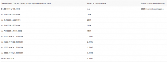 Oltre al bonus per l’apertura del conto c’è la possibilità di ricevere un ulteriore bonus di 300€ in commissioni trading se, entro il 28/02/2014 si trasferisce sul nuovo conto Fineco aperto almeno 50.000 euro di Titoli e/o Fondi o nuova Liquidità (che non potrà provenire da altri conti Fineco o da altre Banche del Gruppo UniCredit) poi investita in Fondi e un bonus aggiuntivo in conto corrente (come ulteriore bonus premio del conto stesso), da un minimo di 100€ fino ad un massimo di 4.000€, se, sempre entro il 28/02/2014 trasferisce almeno 100.000 euro di Titoli e/o Fondi o nuova Liquidità poi investita in Fondi.