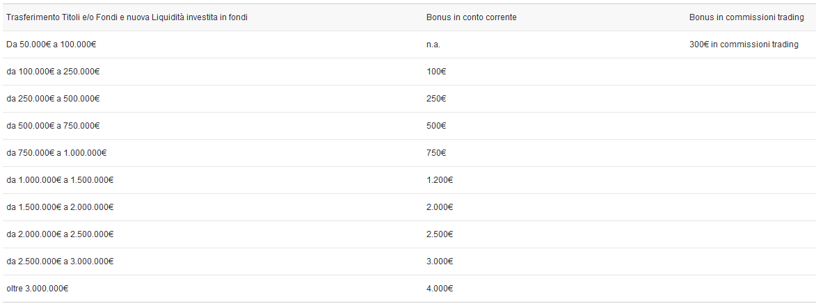 Il valore dell’ulteriore bonus messo a disposizione da Fineco verrà calcolato in funzione del controvalore netto di Titoli e/o Fondi e della Liquidità trasferita presso Fineco e investita in Fondi su uno stesso Rapporto/Conto corrente, in base alla seguente tabella: