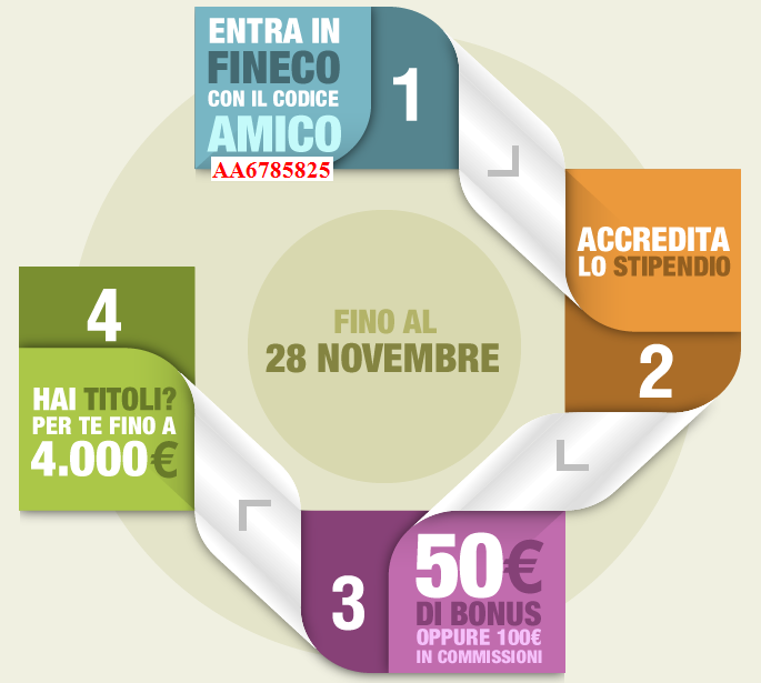 Aprire un conto corrente fineco non solo è gratis e conveniente ma in più grazie a questo codice sconto avrai la possibilità di ricevere a scelta un bonus di 50€ in conto o 100€ in commissioni trading grazie a questo sconto coupon fineco.